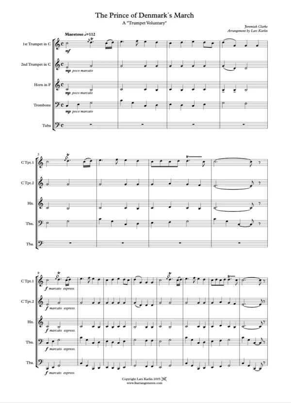 Score & Parts in the key of C: 2 Trumpets in C, Horn in F, Trombone, Tuba & Score in C