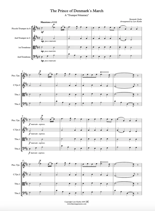Score & Parts: 2 Trumpets in C (Optional: 1st Piccolo Trumpet in A & 2nd Trumpet in C), 1st Trombone (or optional Horn in F part), 2nd trombone & Score in C