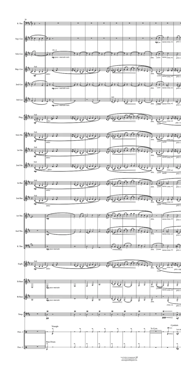 Flugelhorn in Bb, Solohorn in Eb, 1st and 2nd Horn in Bb, 2 Baritones in Bb, 2 Trombones in Bb, Bass Trombone in C, Euphonium in Bb, Tuba in Eb, Tuba in Bb, Timpani & Score in C.