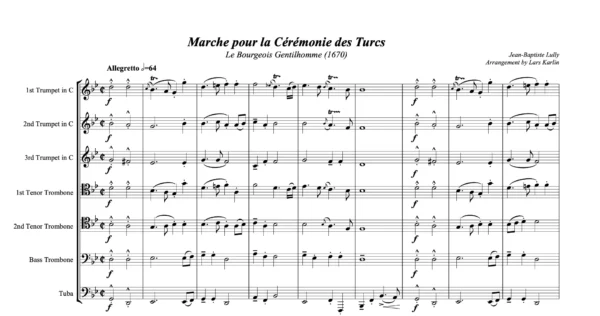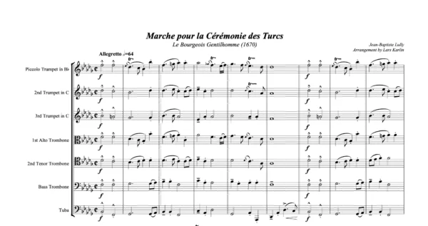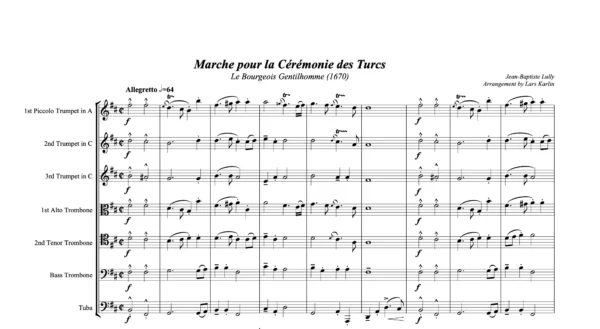 B Flat minor: 1st Piccolo Trumpet in Bb, 2nd & 3rd Trumpet in Bb or C, 2 Tenor Trombones, Bass Trombone, Tuba & Score in C